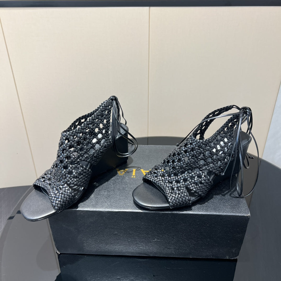 Alaia 25 Round-toe Braided Wedge Sandals 75mm Black Woven Leather 433565