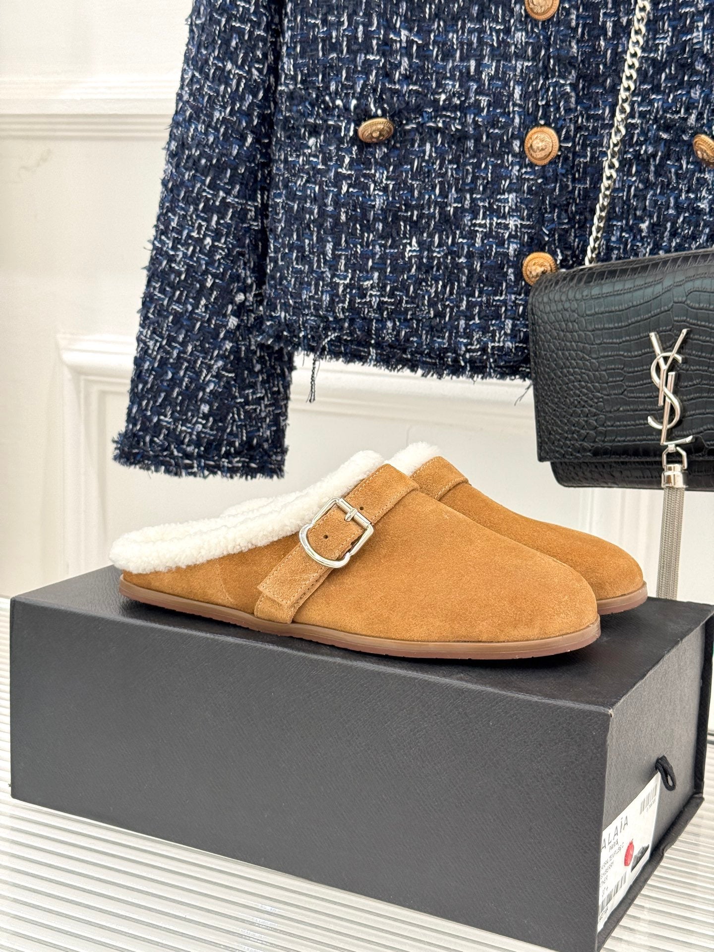 Alaia 25WF slippers belt buckle caramel brown suede wool 472229