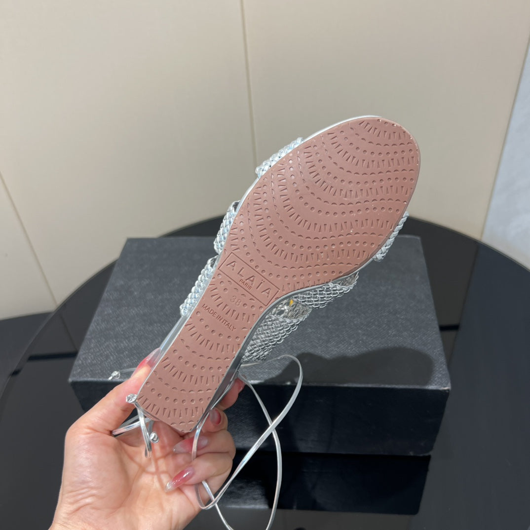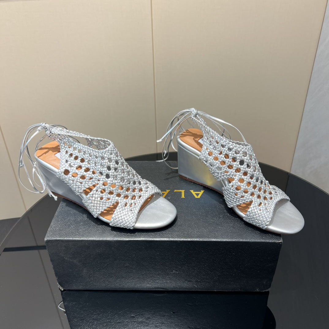 Alaia 25 Round-toe Braided Wedge Sandals 75mm Silver Metallic Woven Leather433570