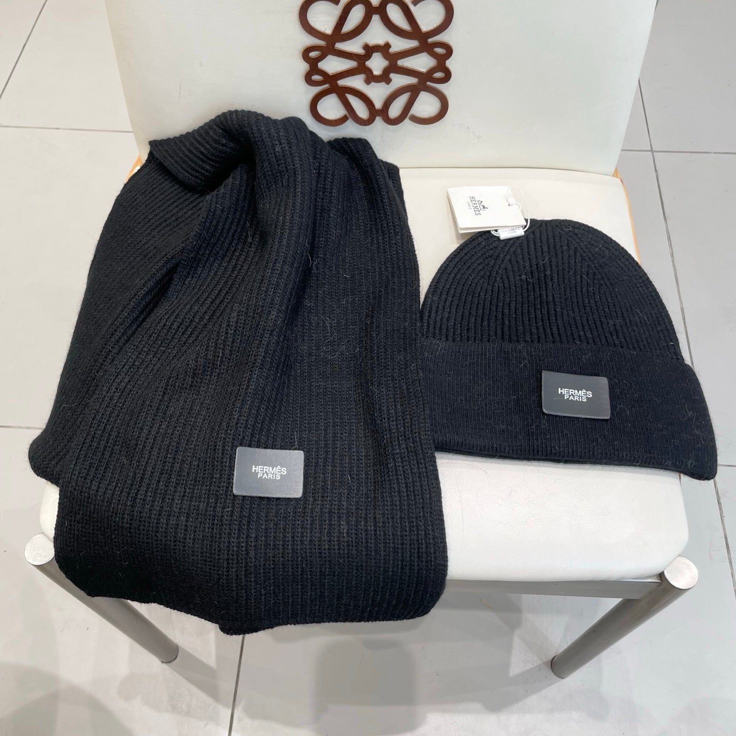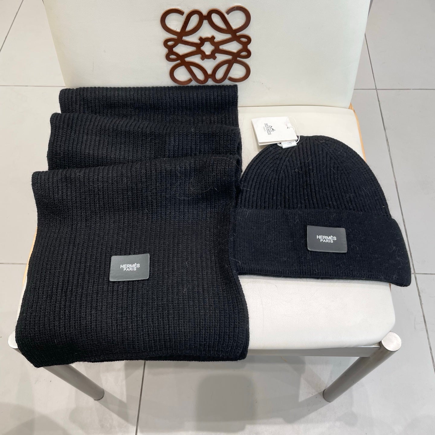 Hermes Classic Hat & Scalf Set Black Rabbit Fur 980201