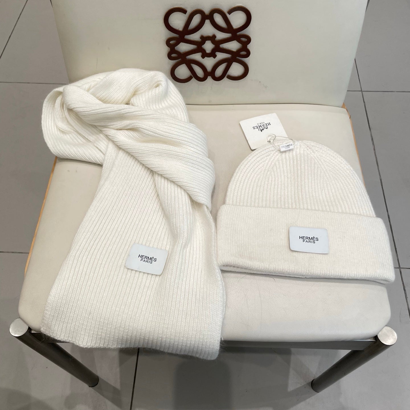 Hermes Classic Hat & Scalf Set White Rabbit Fur 980200