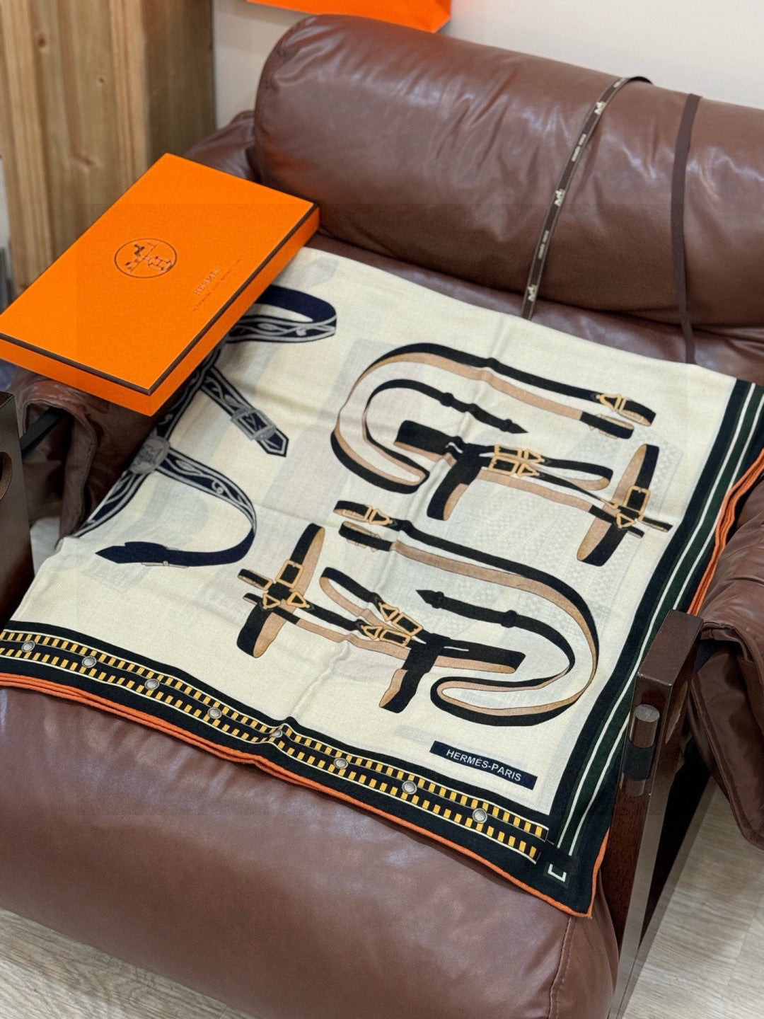 HM 25s Equestrianism Scarf 135cm Cream Black Cashmere Silk 970962