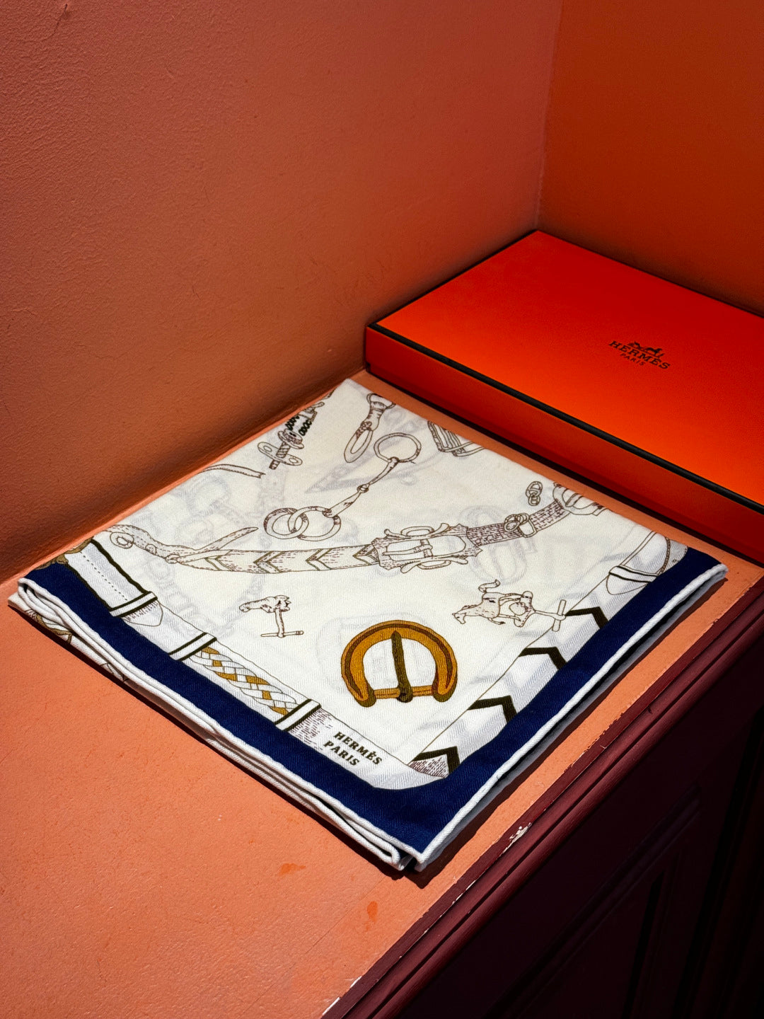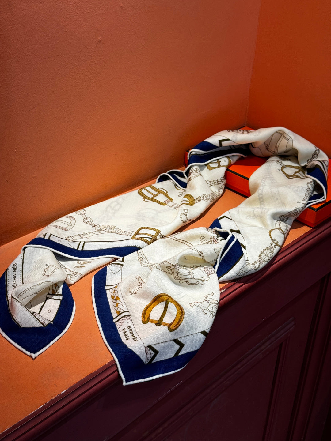 HM 25s Horse Reversible Scarf 140cm Beige Blue Cashmere Silk 967391