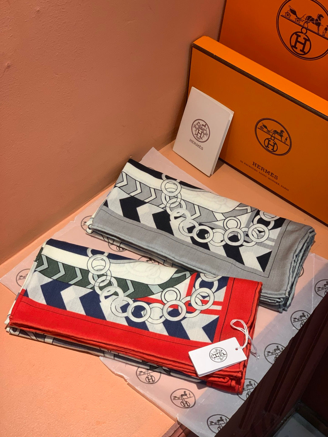 HM 25s Horse Reversible Scarf 140cm White Gray Black Cashmere Silk 967388