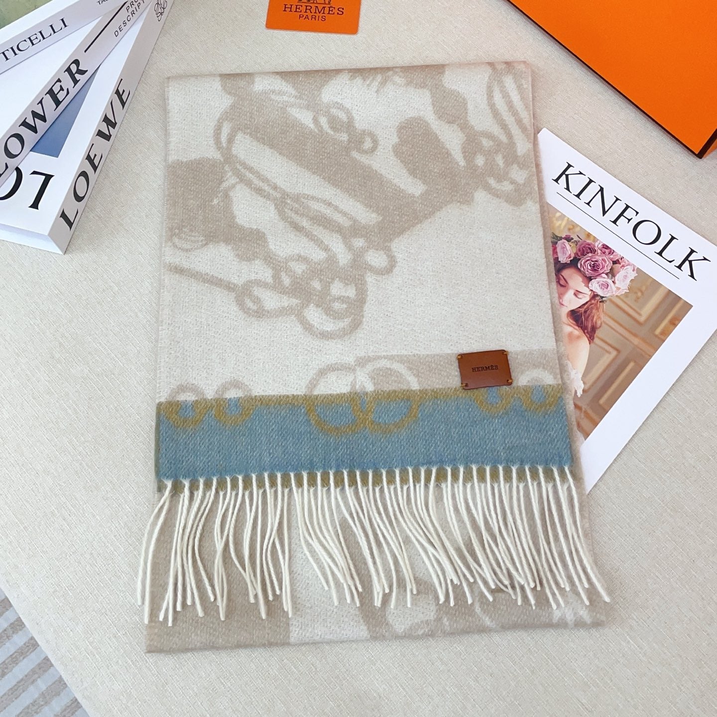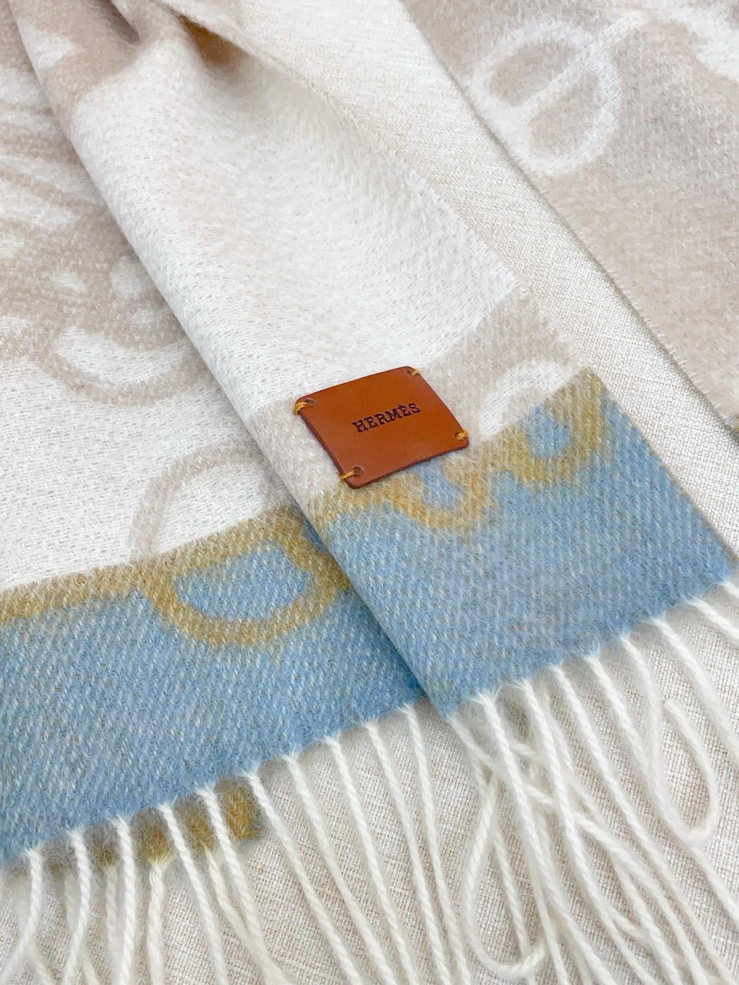 HM Casaque Mors Long Scarf Grey White Blue Cashmere 139453