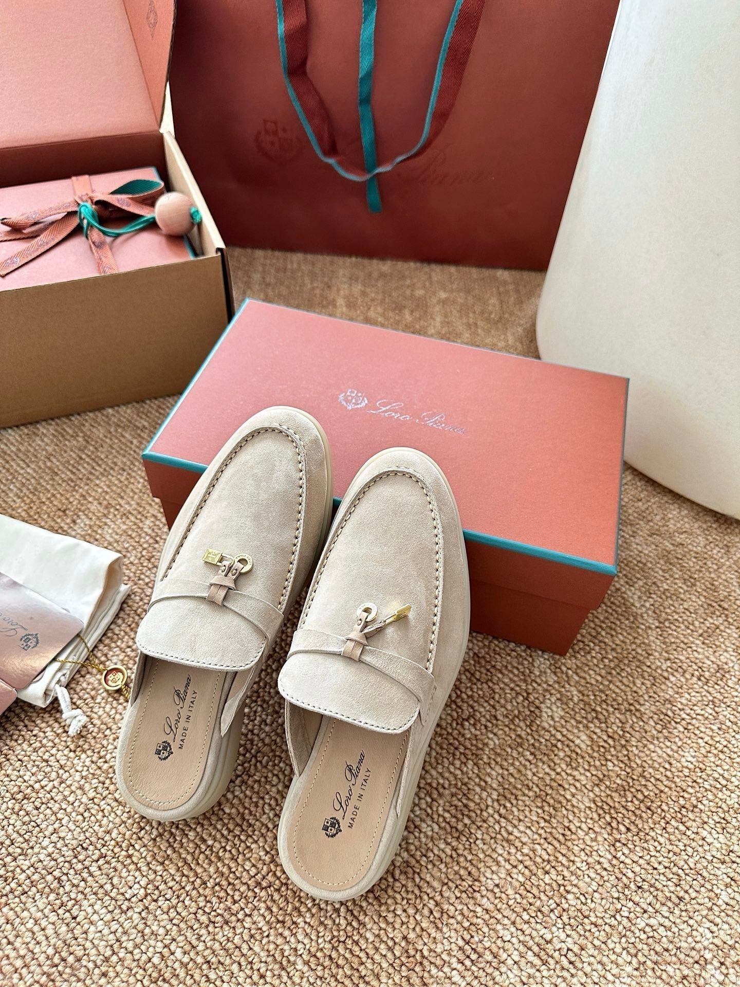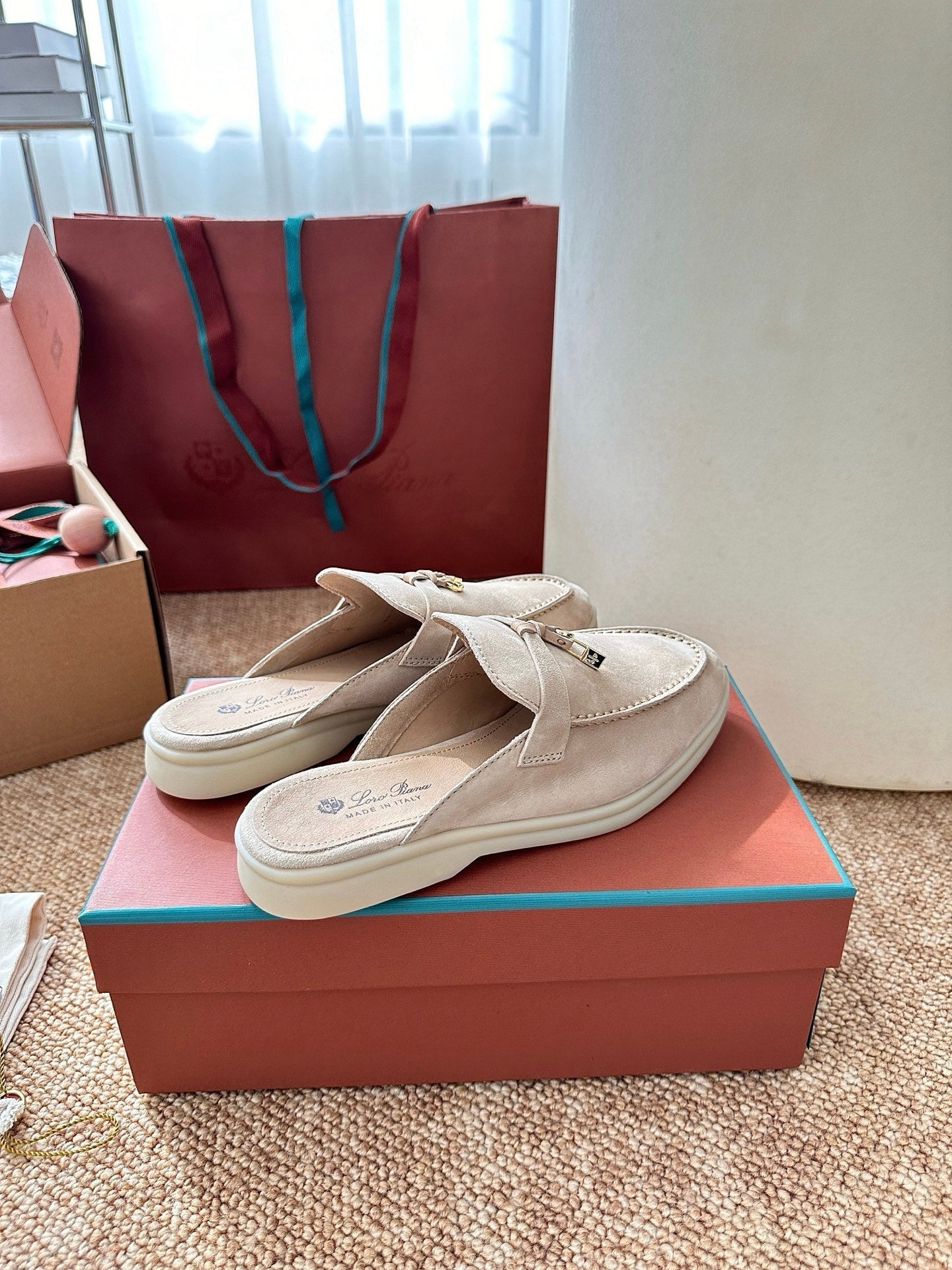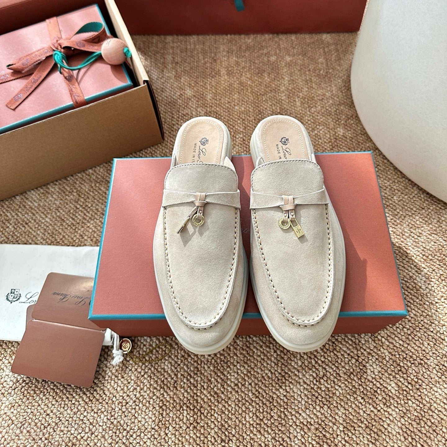 Loro Piana Charms Walk Flat Mules Apricot Suede 623556