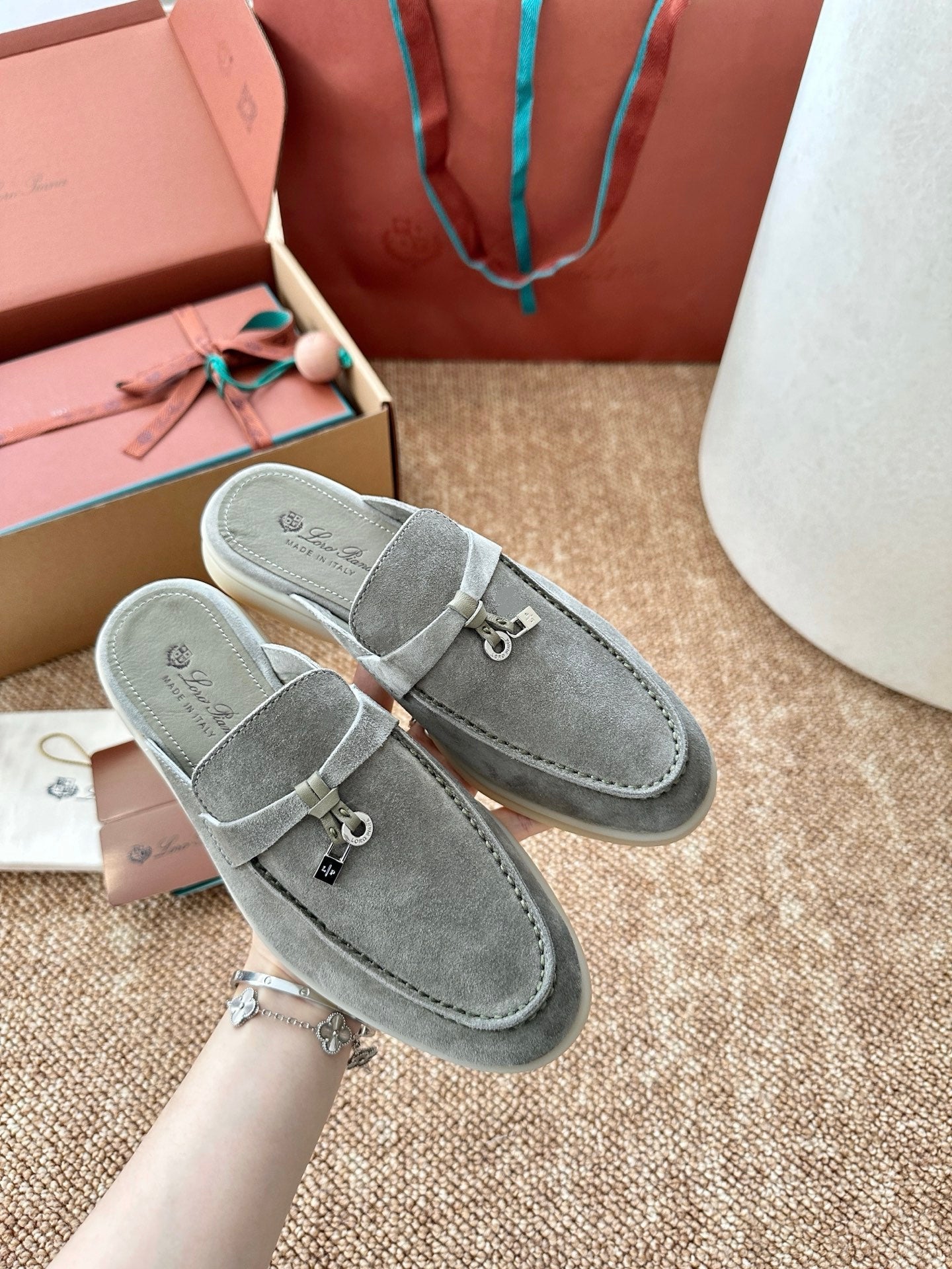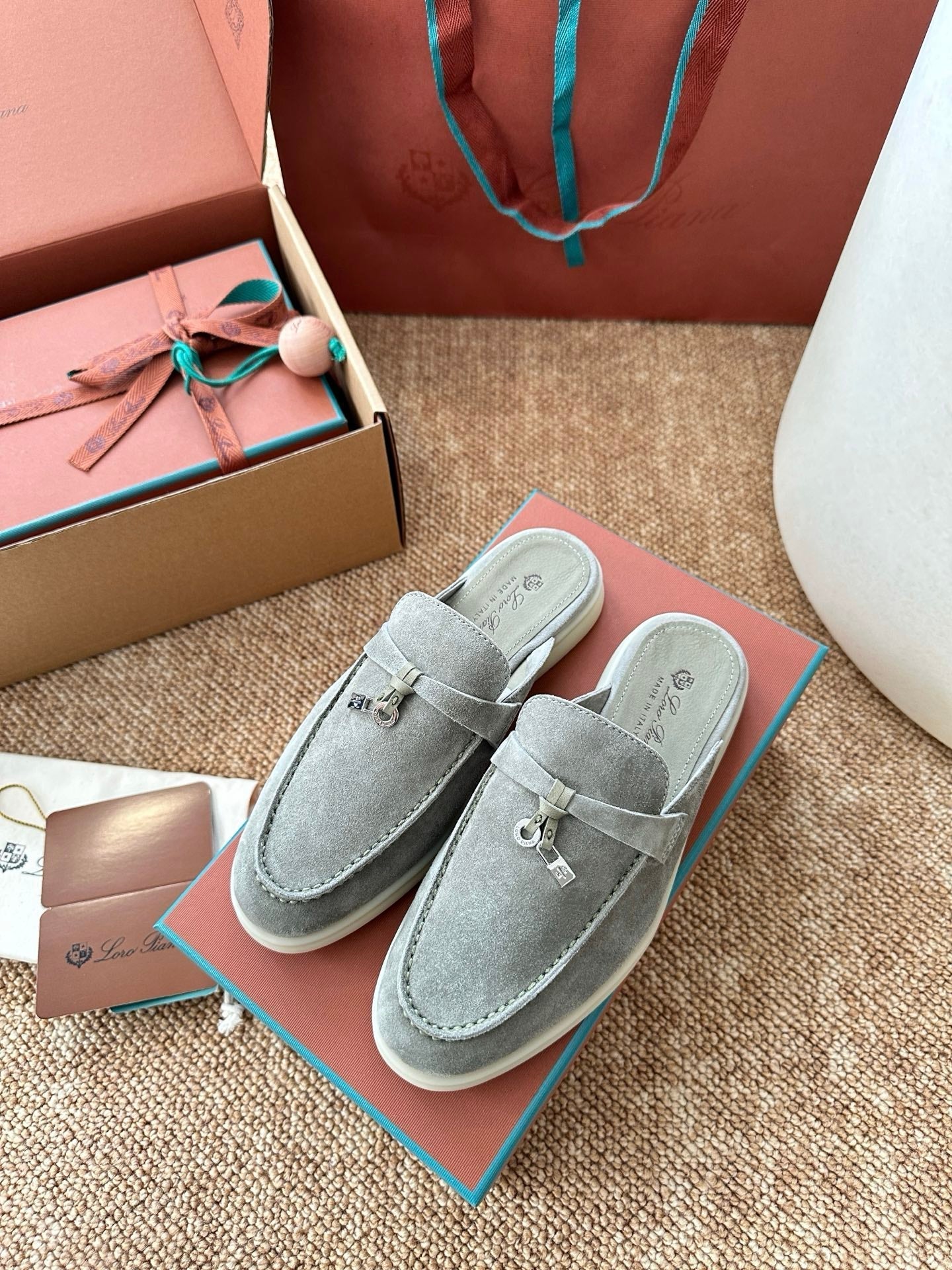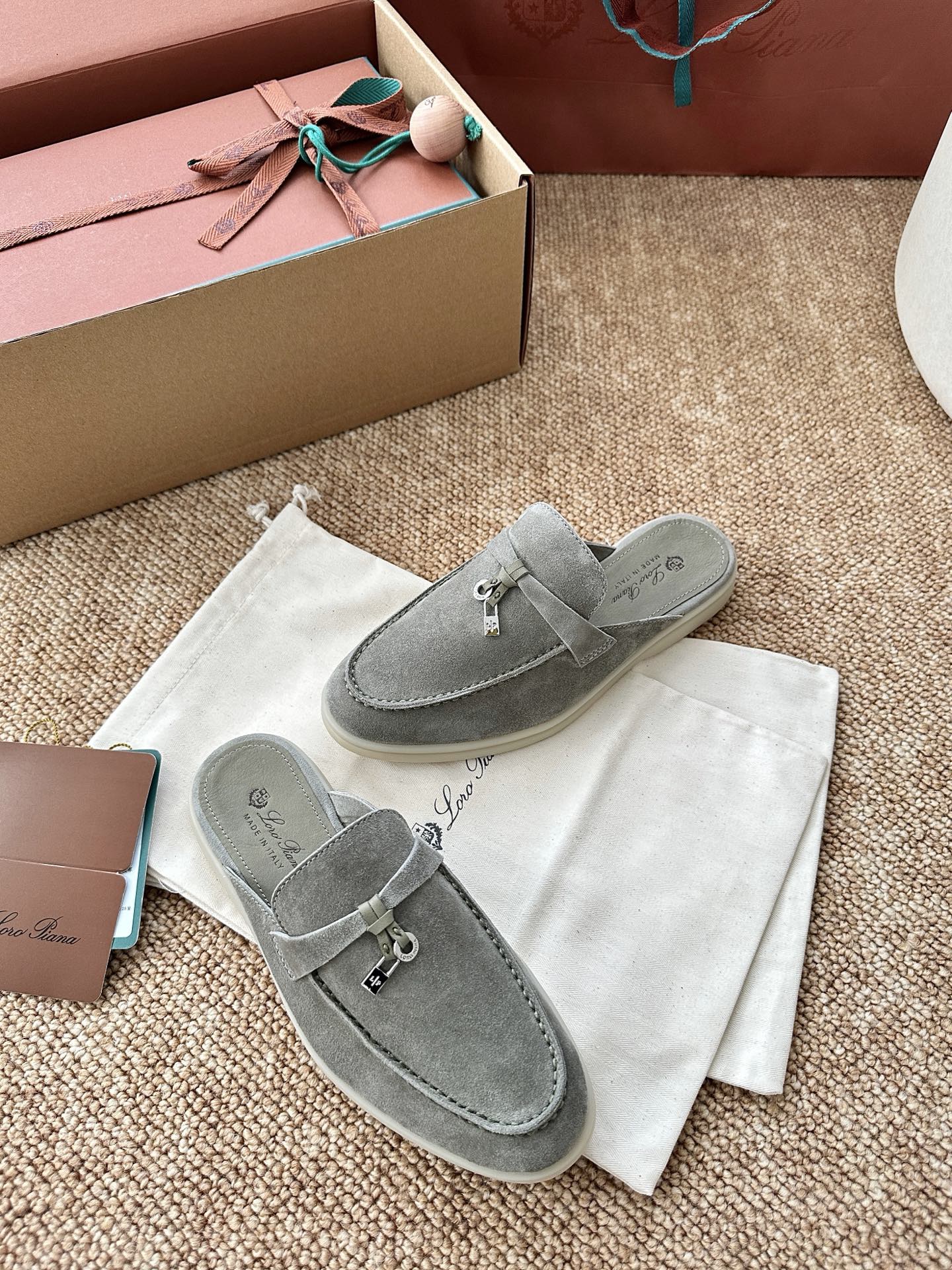 Loro Piana Charms Walk Flat Mules Gray-Green Suede 623552