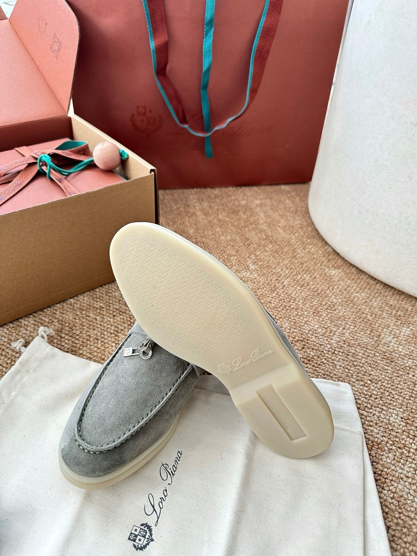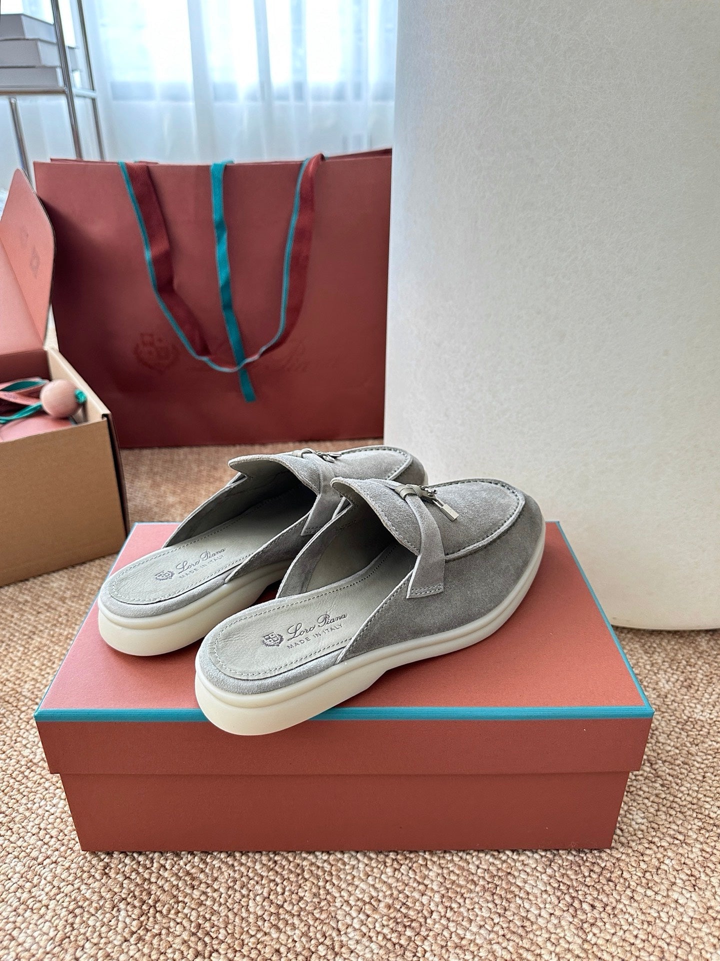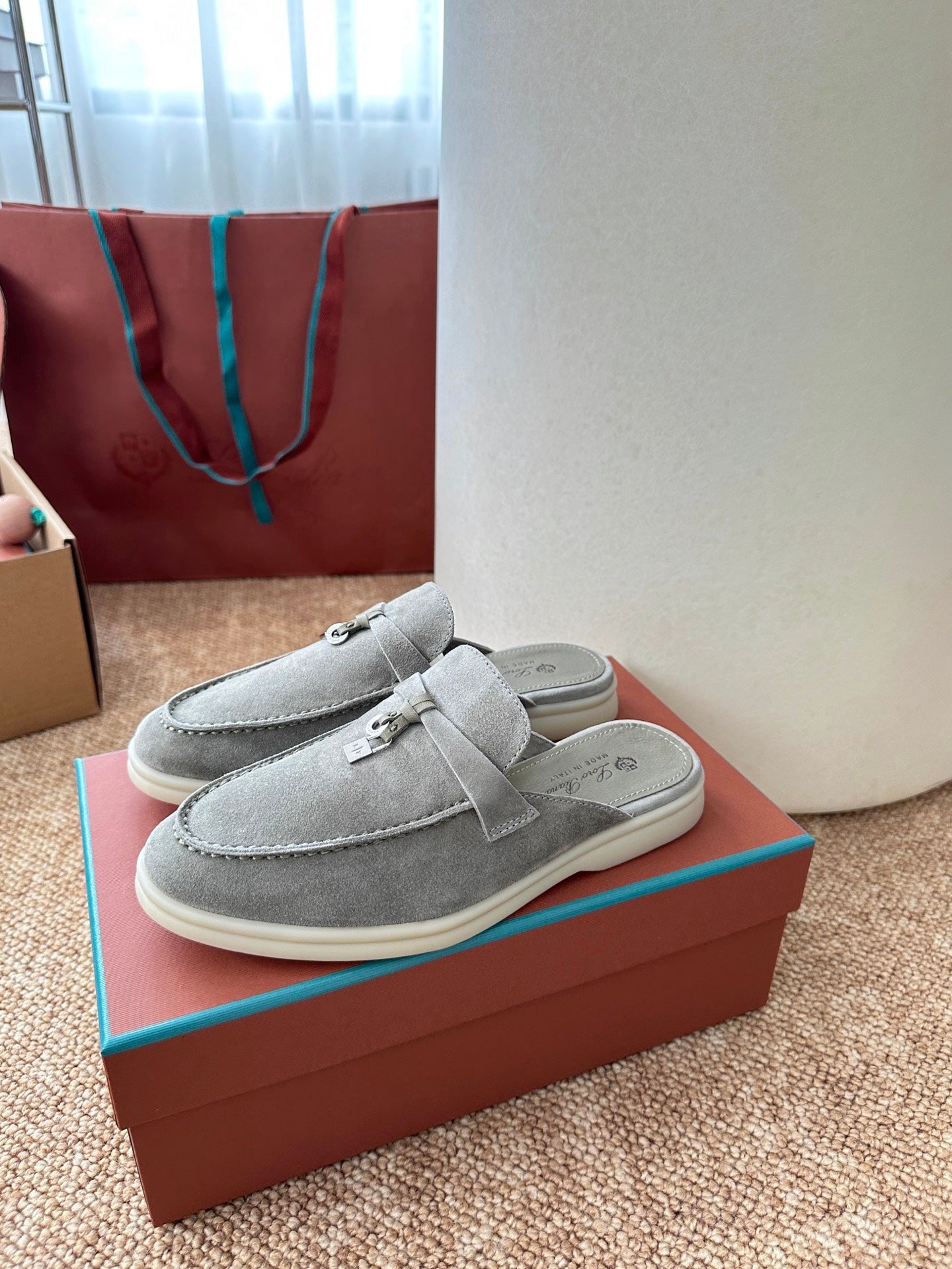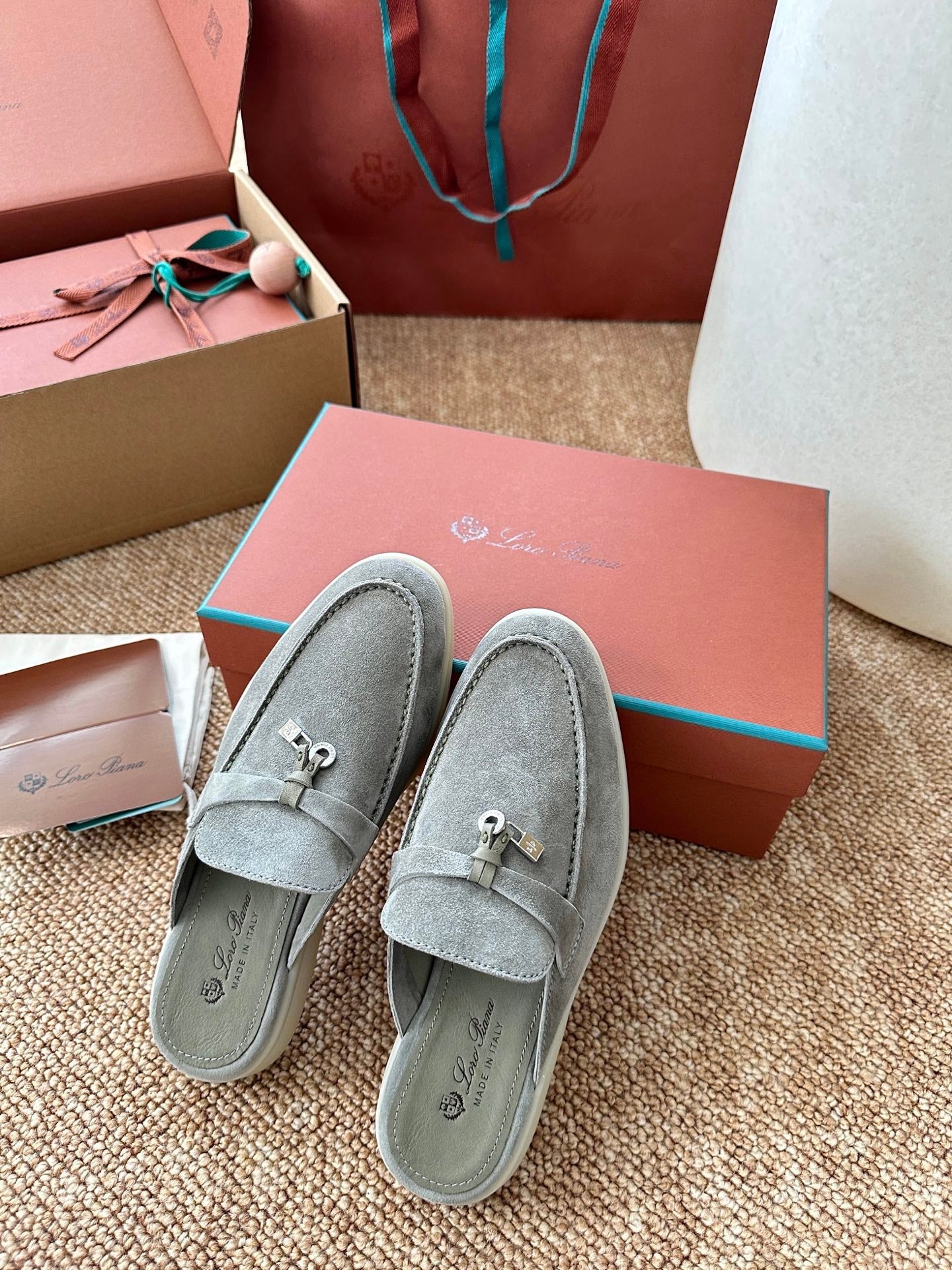 Loro Piana Charms Walk Flat Mules Gray-Green Suede 623552