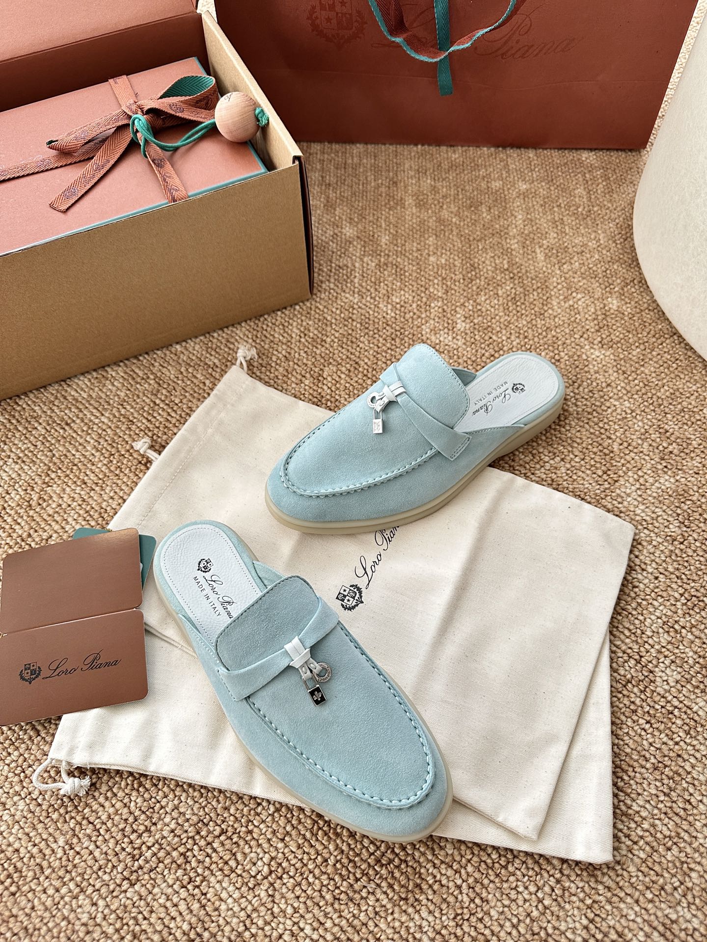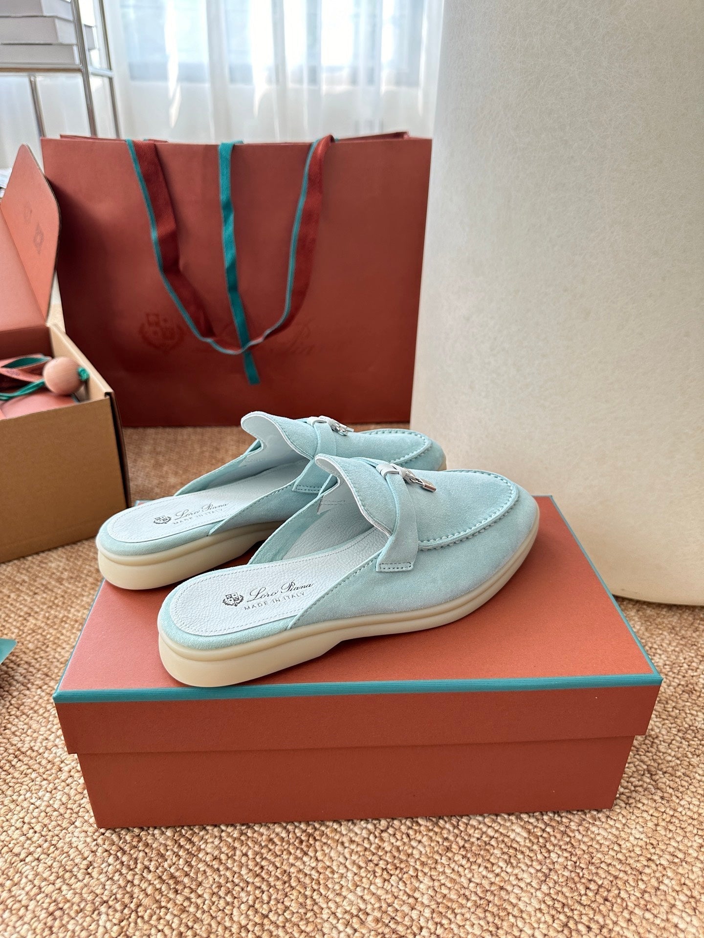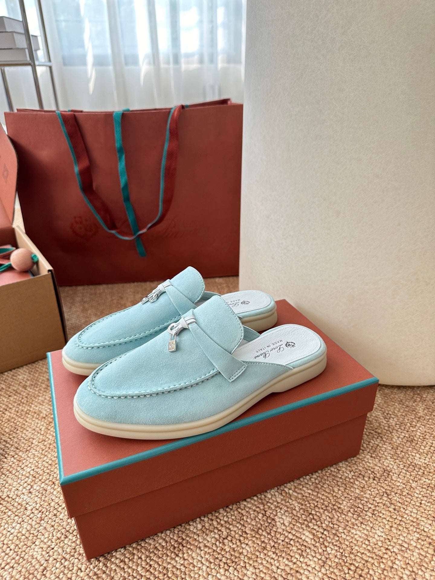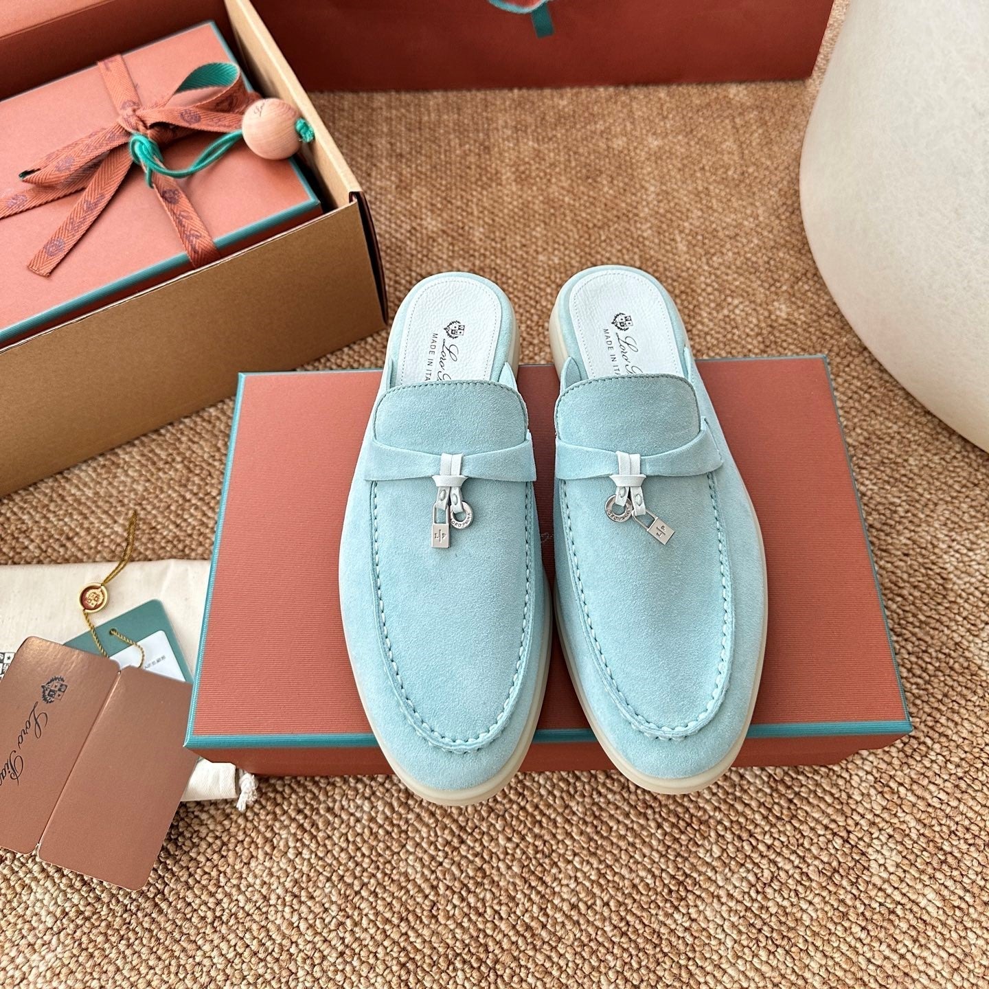 Loro Piana Charms Walk Flat Mules Pale Blue Suede 623551