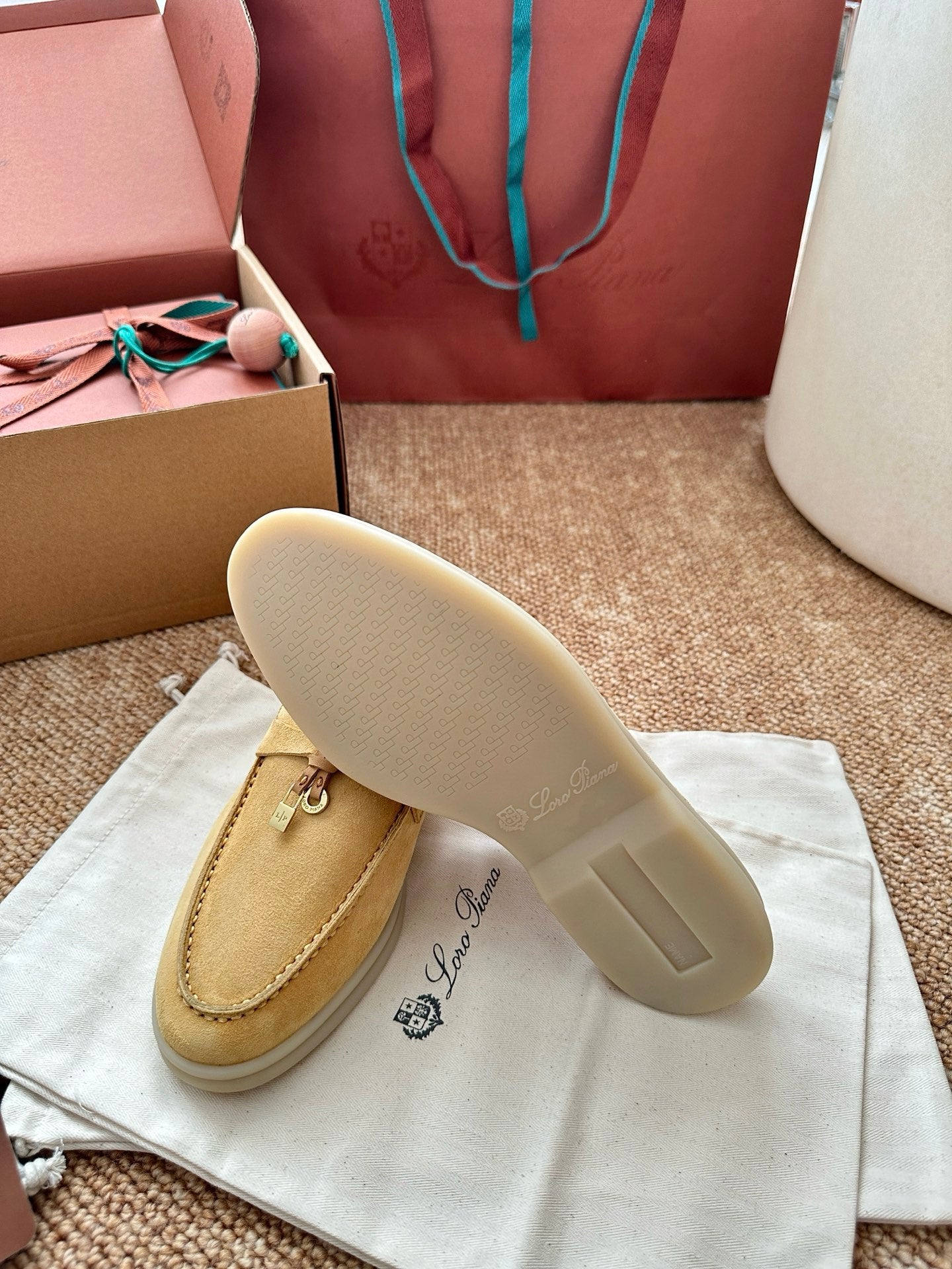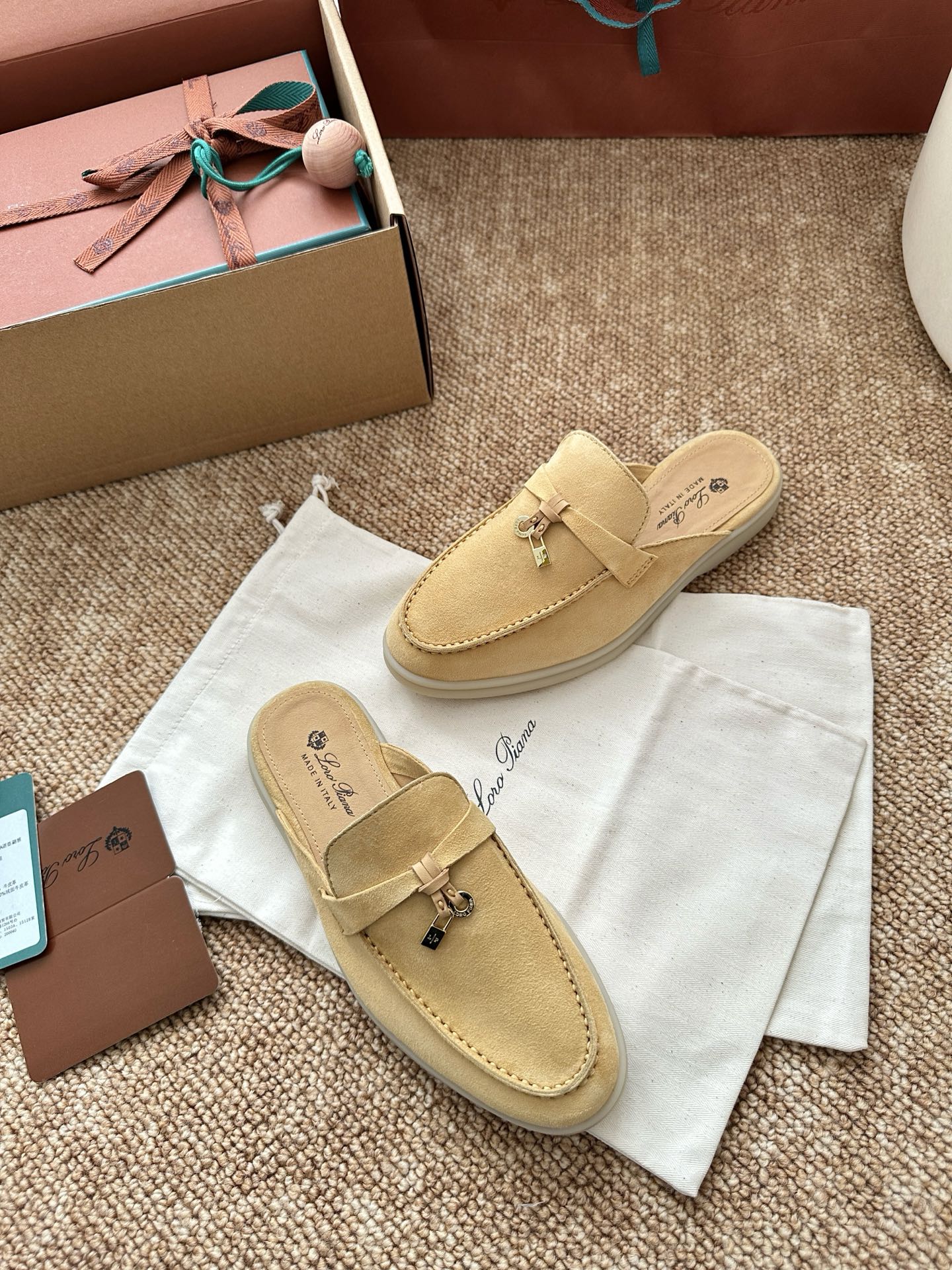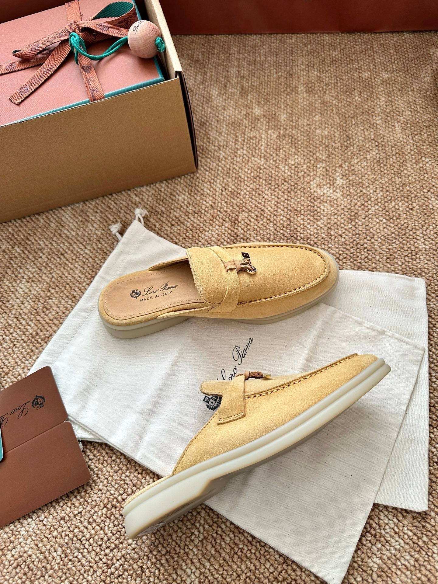 Loro Piana Charms Walk Flat Mules Saffron Tea Suede 623559