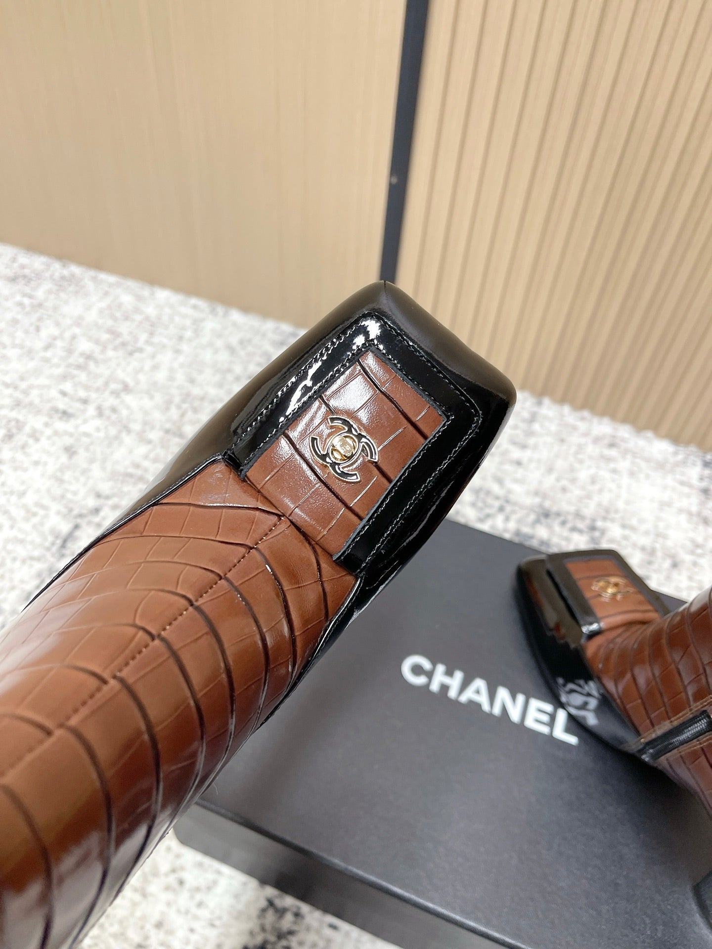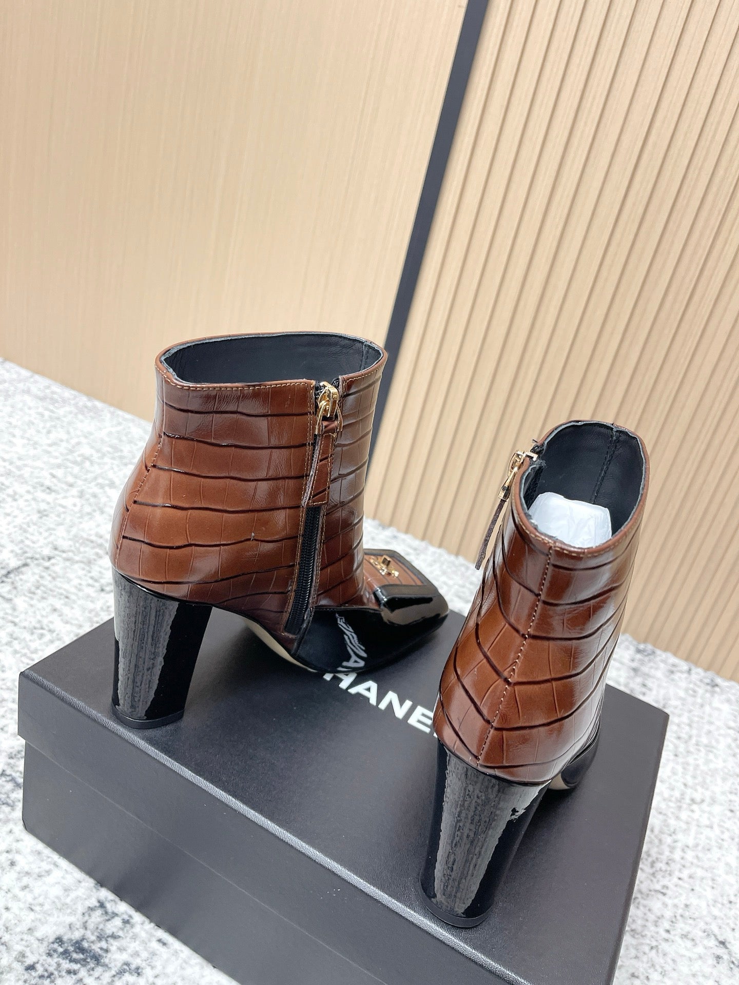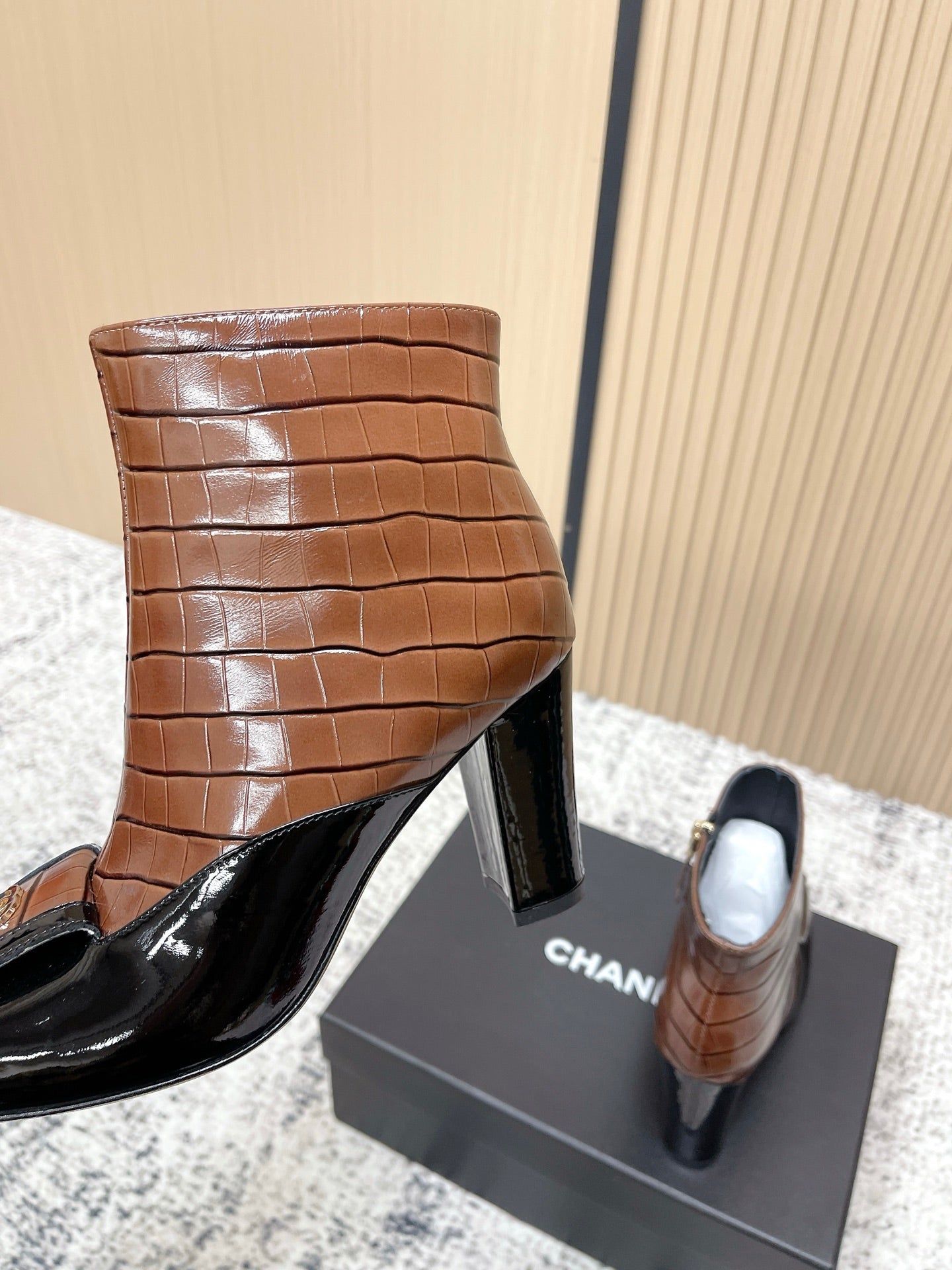 Chanel Croc-Embossed Square-Toe Dark Brown Ankle Boots in Cowhide 591401