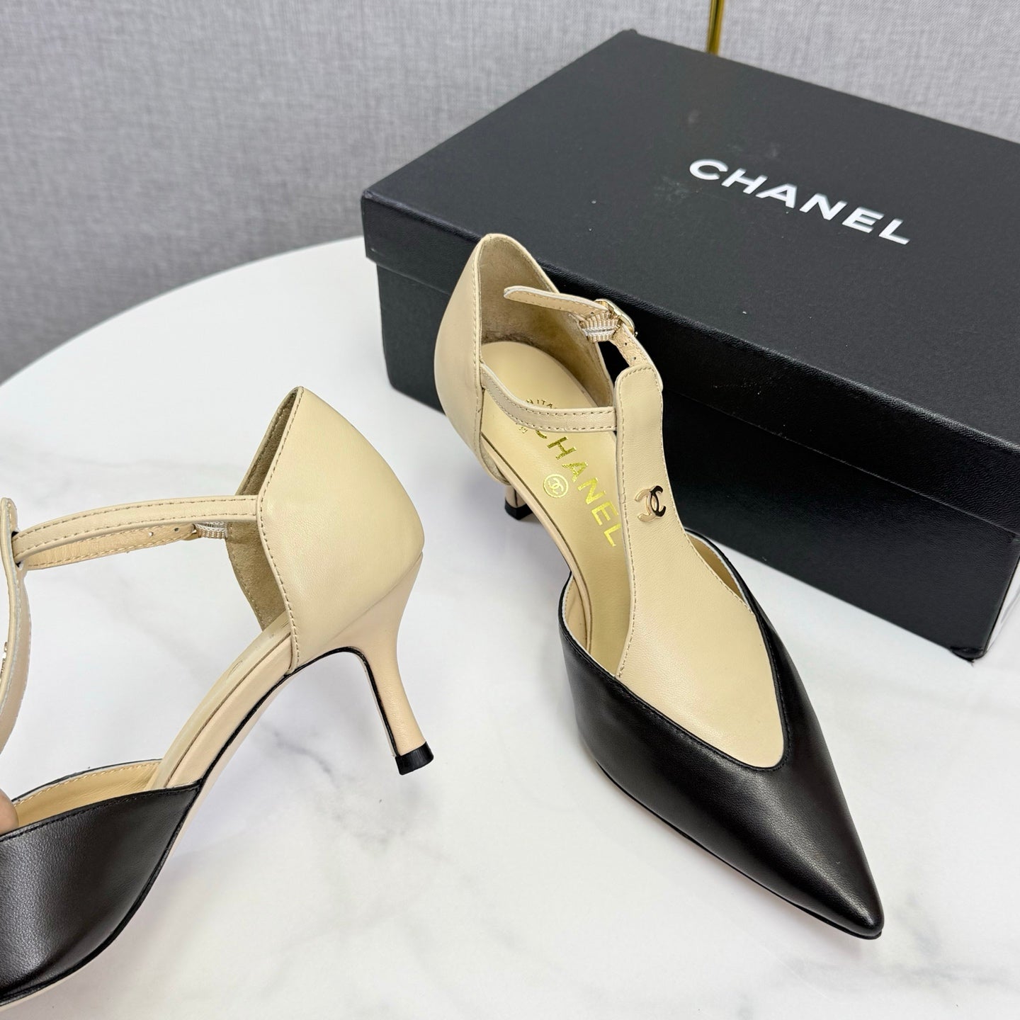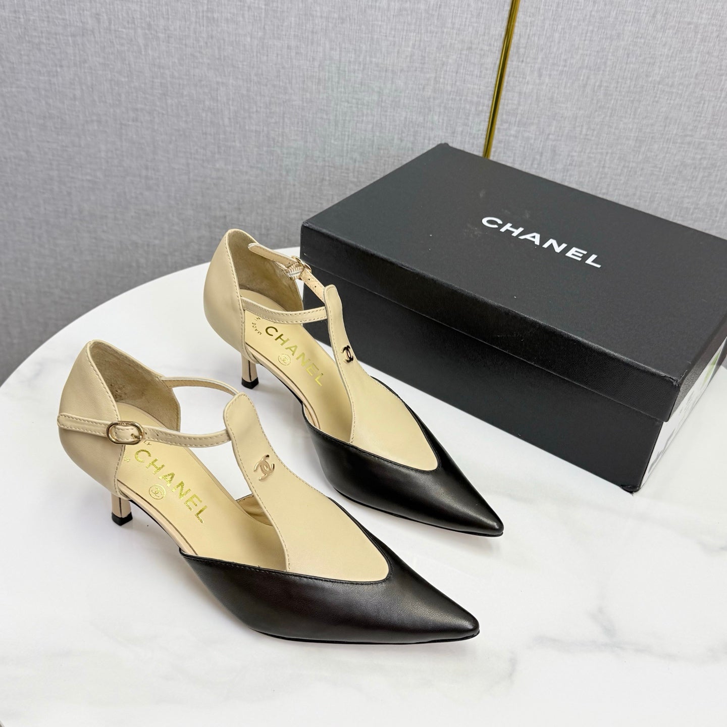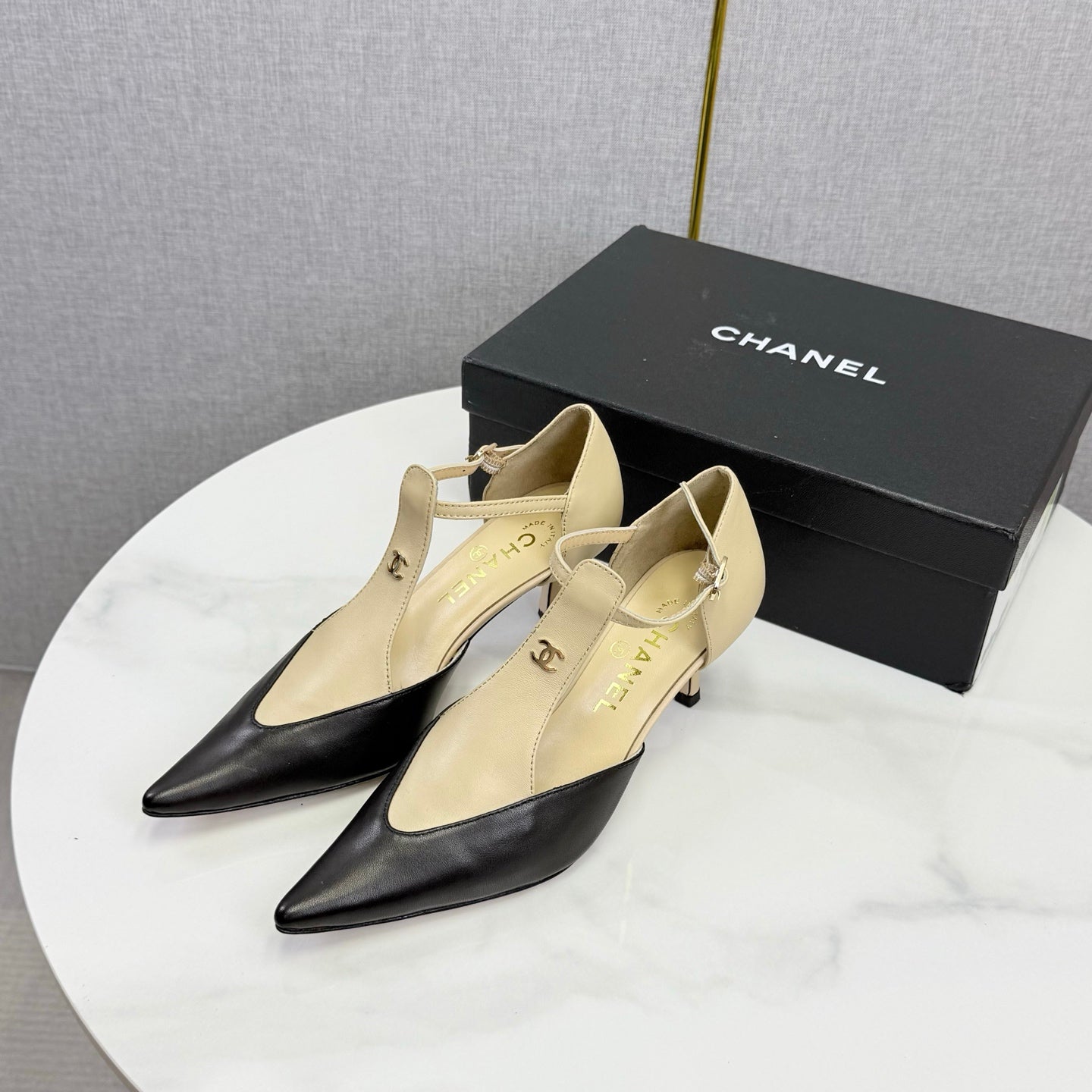 CC T-Strap Kitten Heels Beige Black Sheepskin 619975