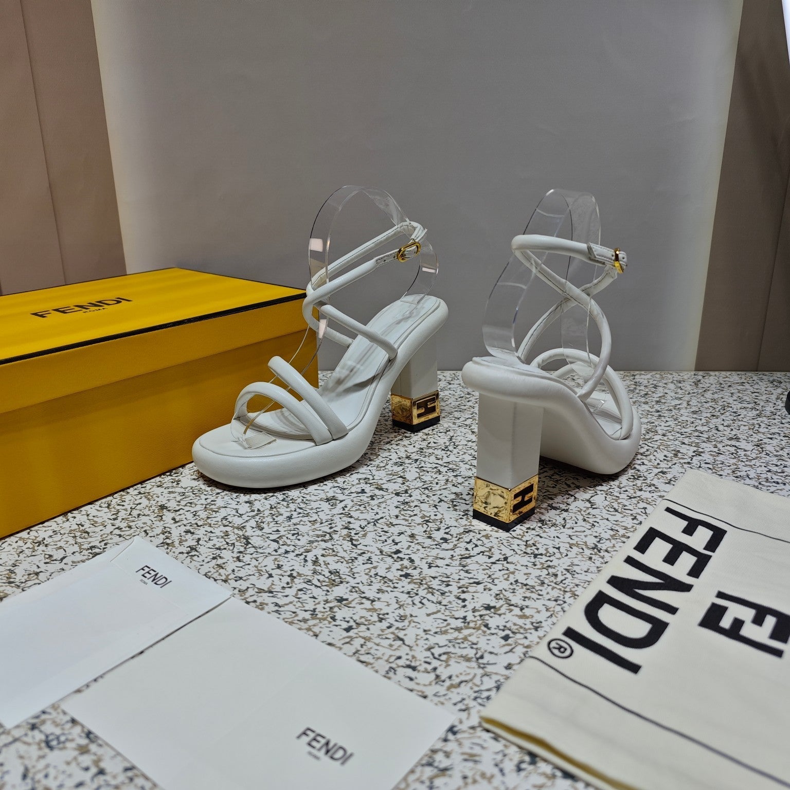 FENDI CHUNKY HIGH-HEELED SANDAL IN WHITE CALFKIN WITH GOLD HARDWARE