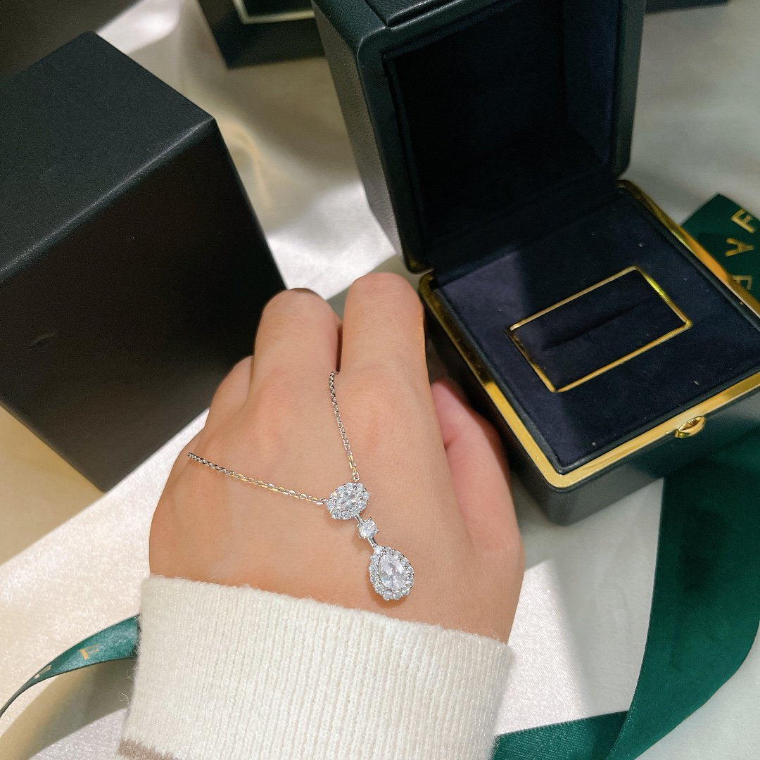 OVAL AND PEAR SHAPE SILVER DIAMOND DROP NECKLACE