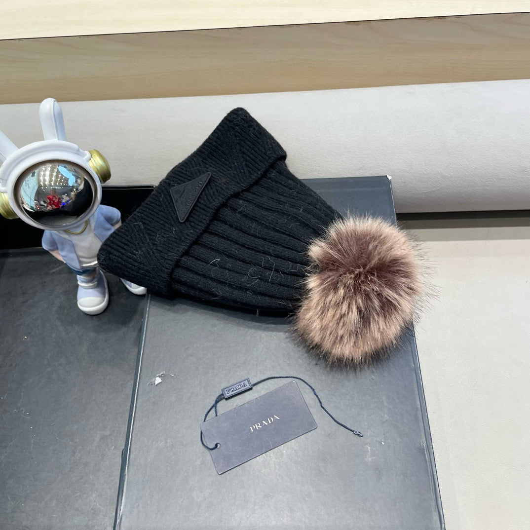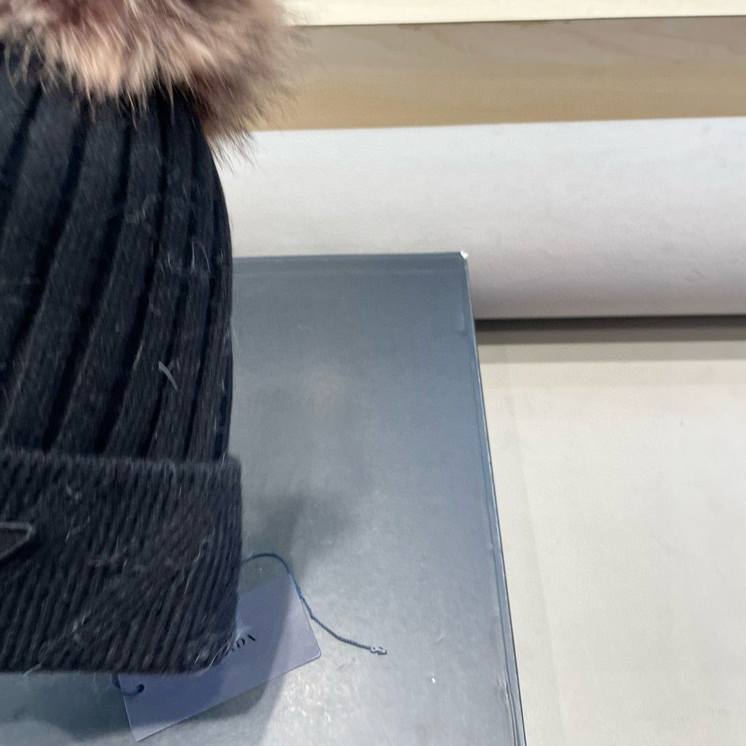 Prada Fleece-Lined Thick Real Fox Fur Pom-Pom Knitted Black Hat 125676