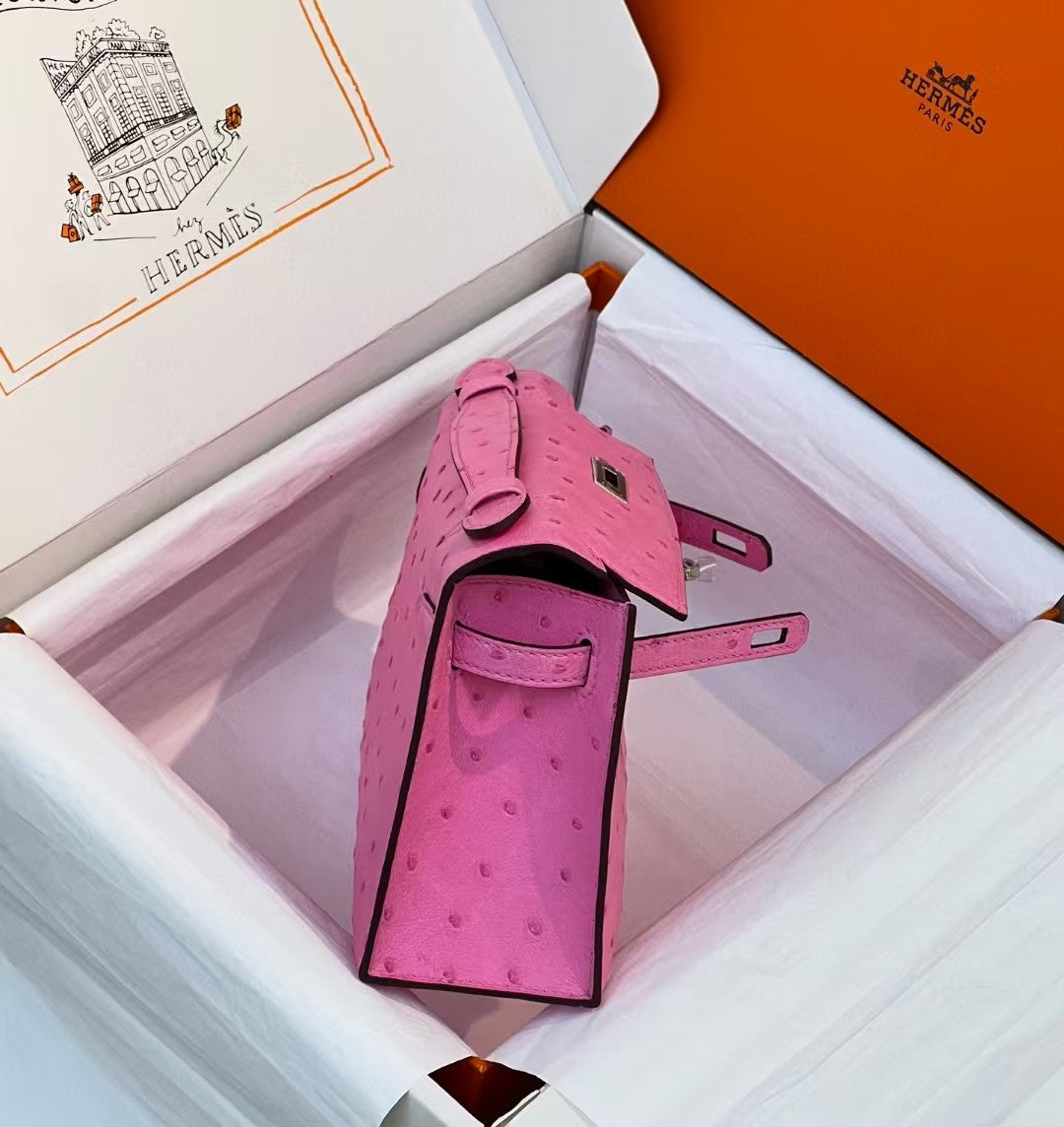 HM Kelly Pochette 20cm Bubblegum Pink Ostrich Leather Silver Hardware
