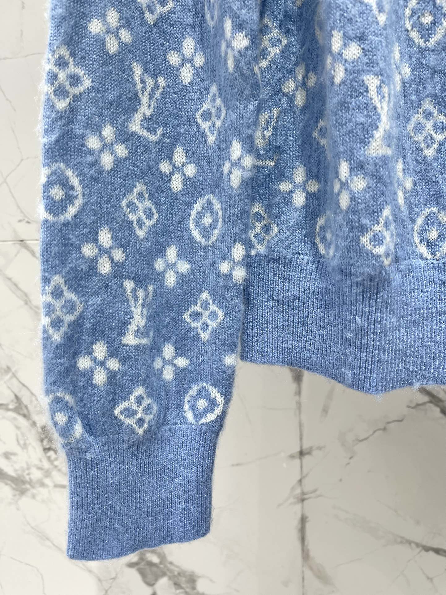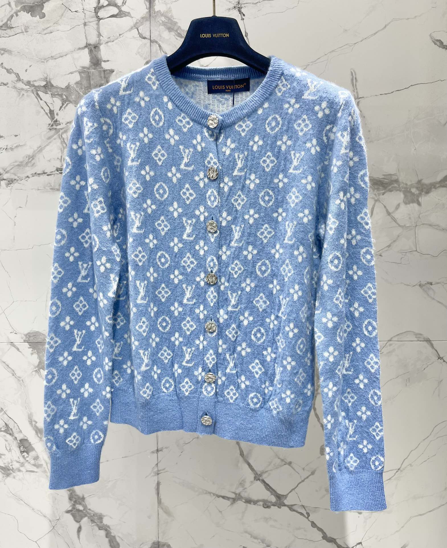 LV Monogram Jacquard All-over Print Blue Cardigan with Monogram Pattern