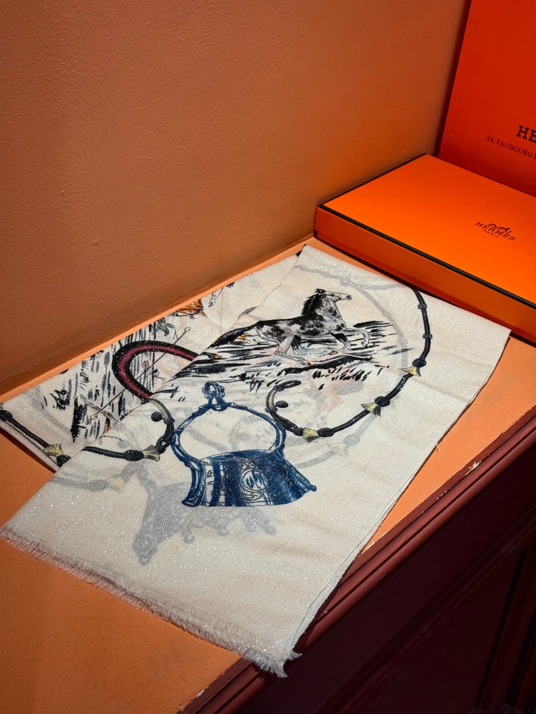 HM 25s Radiant Scarf 200cm White Blue Cashmere Silk 962391