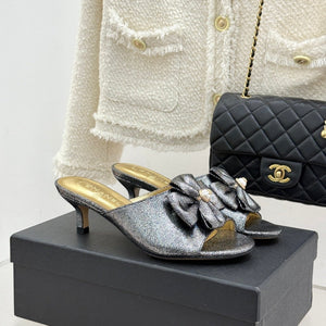 CC 26s Bow Slippers High Heel 35mm Dark Silver Metallic Satin Sheepskin 615747