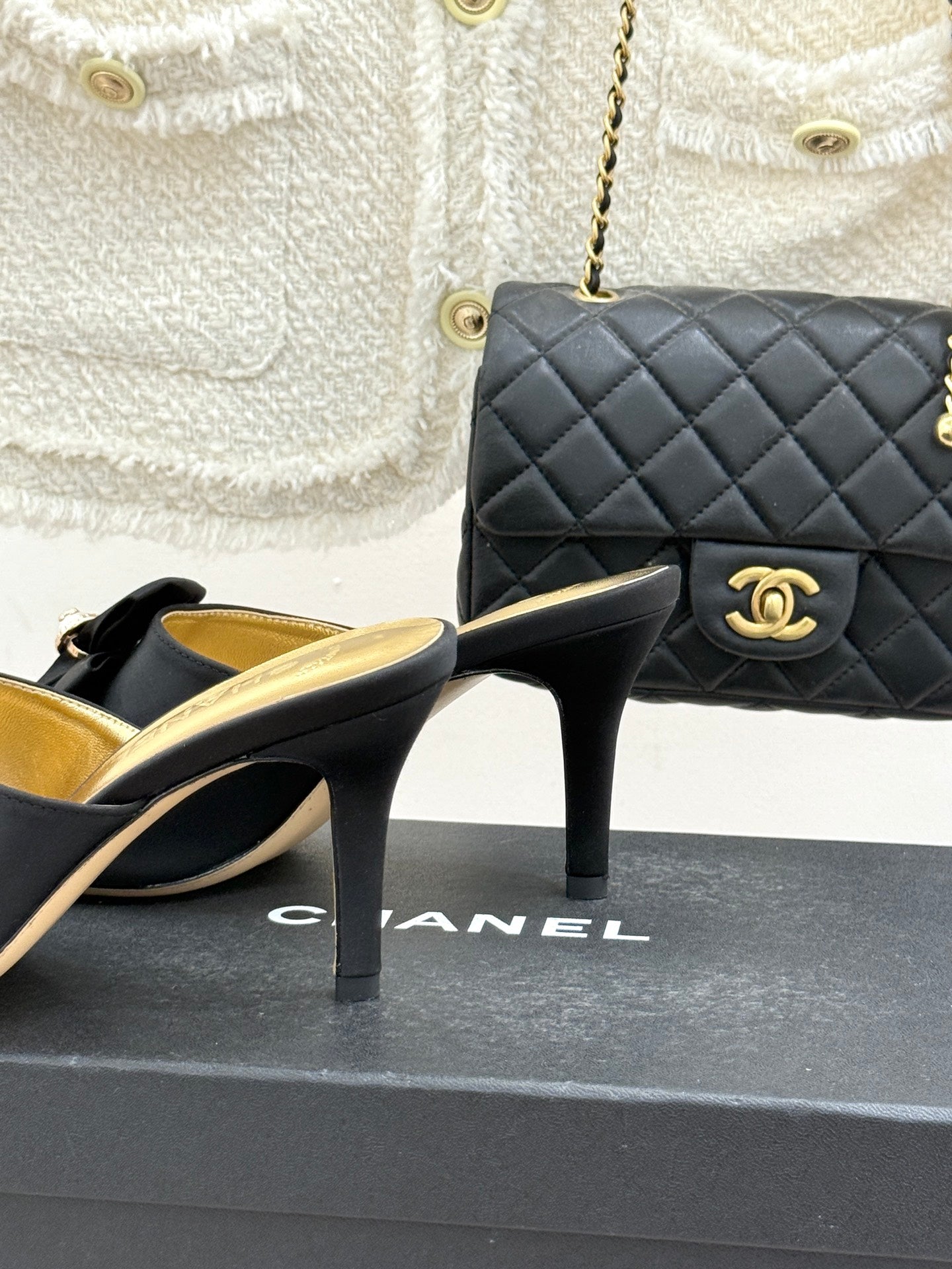 CC 26s Bow Slippers High Heel 75mm Black Satin Sheepskin 615745