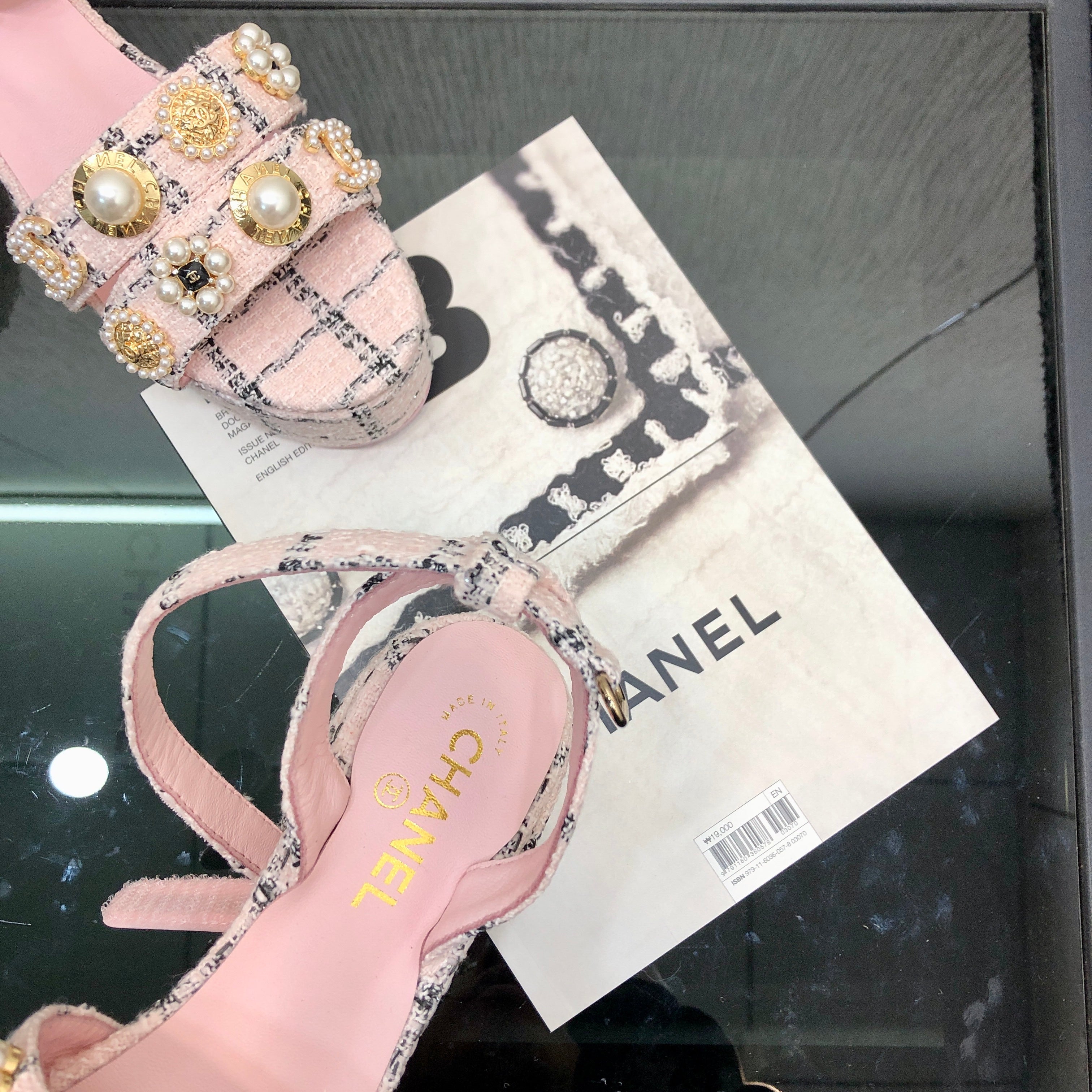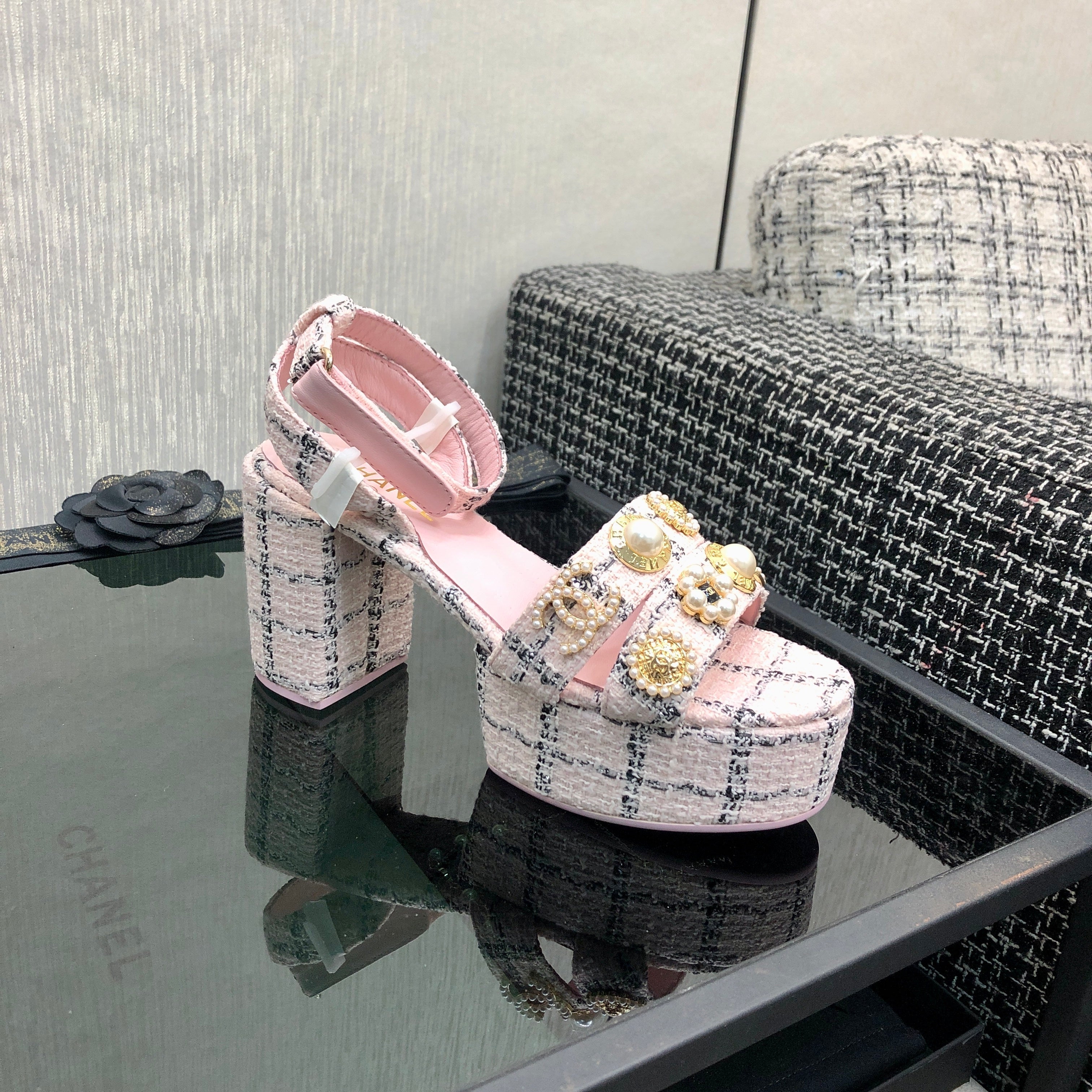 Chanel 26 Runway Style High-Heeled Sandals Pink in Tweed Fabric 602480